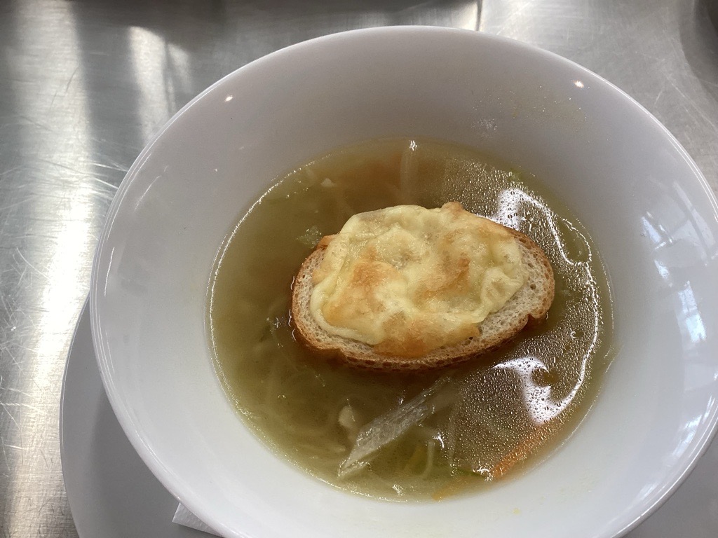 今日のメイン、サーモンのムニエルは“白ワインソース”。 「うわ、めっちゃフランス料理じゃん…!」って思わずテンションが上がった。 こういう“本格っぽさ”が味わえるのも実習の楽しさだと思う。