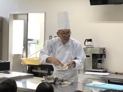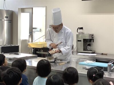 先生、ちょっと緊張気味でぎこちない。けど画像や調理器具を駆使して、園児たちの視線をガッチリキャッチ。ここはさすがベテラン。