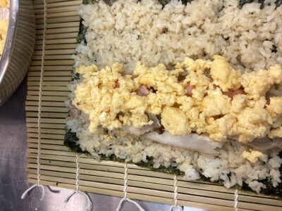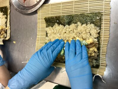 すし飯の広げ方、具材の置き方、巻くときのコツを教わって、