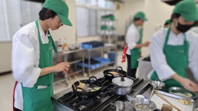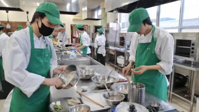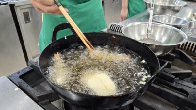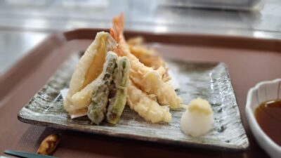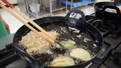 10月16日 3年生 日本料理 フードクリエイト科 2025/10/17 天ぷらの盛り合わせ 2年生のころから何度かチャレンジした、天ぷら! 今回はエビと鱚も入って豪華バージョン 材料の仕込みはお手のもの!いざ油に入れて揚げていく。 油の温度を確認して材料を投入。 カラッと揚がるように温度に気を付けながら。。。 集中して揚げるのは大変だ。 野菜とえびなどによって、衣の硬さを変えるのが大変だった。 けど前回よりきれいに揚げれて、少し成長して良かったです。 また家で家族にも作ってあげたいと思いました。