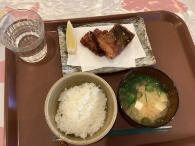 献立は、立田揚げ・みそ汁・ご飯。めっちゃ楽しみにしてました。